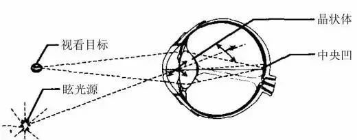 眩光使视觉功能降低的机理可以这样来理解:由眩光源发出来的光,在视网膜方向上散射,形成一个明亮的光幕,叠加在清晰的场景像上。这个光幕具有一个等效光幕亮度(equivalent veiling luminance),其作用相当于使背景亮度增加,对比度下降,使人产生眩光感,并且难以看清目标。