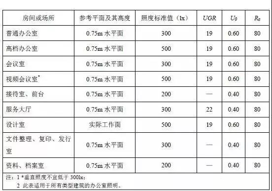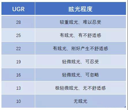 图:一般根据不同的环境会有不同的UGR值上限要求,例如:普通办公室环境的典型UGR值为19。