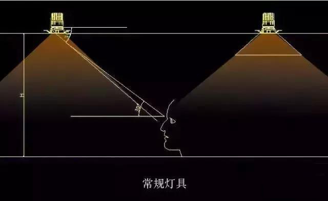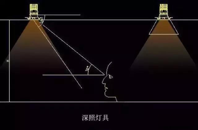 图:光源深藏的深照性灯具在其结构不变的情况下,增大光源的安装高度,以达到增大遮光角的目的